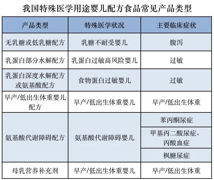 下表列出了6种常见的特殊医学用途婴儿配方食品,其中,乳蛋白深度水解配方奶粉就是上文医生建议这位妈妈选用的特医食品。