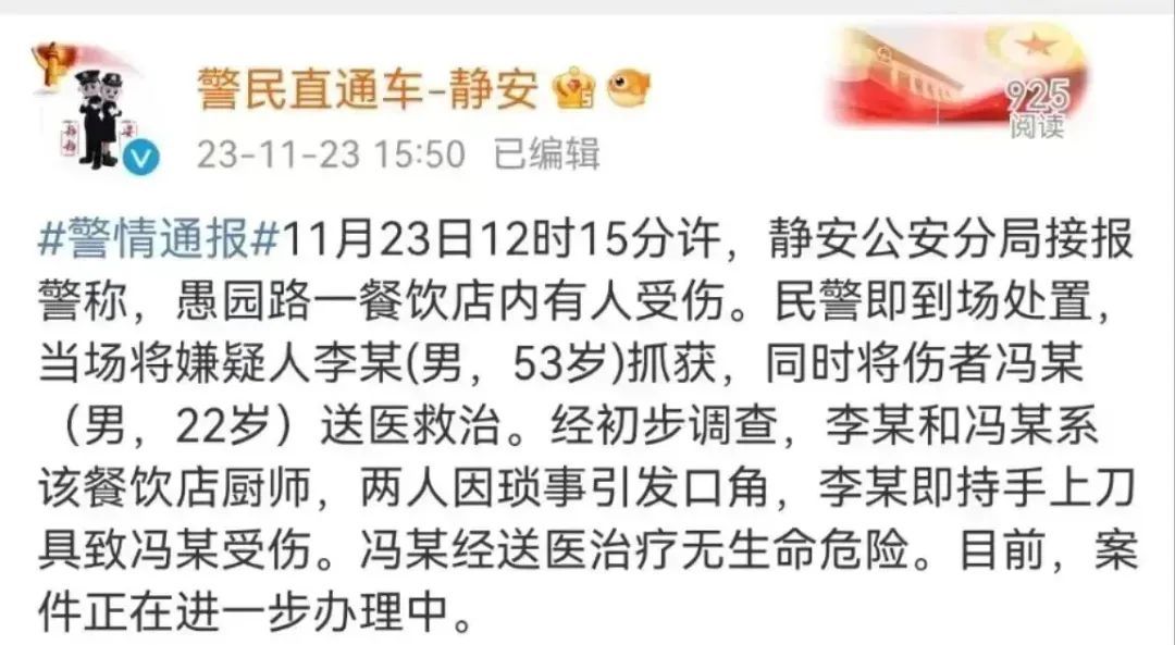 ● 晴转多云 8℃-13℃ 民生 上海街头现不少“黑灯”夜骑者 若引发交通事故或担责 近期,不少机动车驾驶员反映,在行驶过程中稍不留神就有一辆“黑灯”骑行的电动自行车,突然从暗处冒出来,极易造成交通事故。 电动自行车在夜间上路行驶是否应亮灯?根据2021年5月1日起实施的《上海市非机动车安全管理条例》第二十二规定,“在夜间或者遇有雾、雨、雪、沙尘、冰雹等低能见度情况下行驶时,开启照明装置。” 民警表示,《上海市非机动车安全管理条例》实施后,对于“黑灯”骑行,交警可以认定当事人存在交通违法行为,需要承担相应责任。 更多信息请点击链接查看→ 上海宣布: 暂停区域出租汽车 新增额度申请 近日,上海市道路运输管理局发布通知指出,目前出租汽车供大于求,搁车搁单情况严重,为维护行业健康、可持续发展,从即日起暂停本市区域出租汽车新增额度申请。恢复申请时间视市场供需变化情况另行通知。 更多信息请点击链接查看→ 高中生连吃4种感冒药 住进重症监护室! 医生:勿“混搭” 最近,16岁的高中生小赵发烧后同时服用了布洛芬和莲花清瘟,感觉症状没有好转,就又吃了另外两种感冒药,等于是连吃4种感冒药,结果住进了急诊重症监护室。 经医生判断,明确小赵是机械肾功能衰竭横纹肌溶解,是这些感冒药叠加对肾脏的影响。“如果送来得再晚一点,很可能就回天乏术了。” 医生提醒,吃药要避免混搭,各种药混搭不仅容易导致成分剂量加倍,也容易引起药物和药物之间的相互作用,最终损害肾脏、肝脏等脏器。同时,患者在自行服用药物时,应关注药品说明书,不可随意增减药品种类和剂量。如需多种药物同时服用,最好遵医嘱服用。 更多信息请点击链接查看→ 社会 上海愚园路 53岁厨师砍伤22岁厨师被抓 警方通报 据澎湃新闻报道,昨天(11月23日)12时15分许,静安公安分局接报警称,愚园路一餐饮店内有人受伤。民警即到场处置,当场将嫌疑人李某(男,53岁)抓获,同时将伤者冯某(男,22岁)送医救治。 经初步调查,李某和冯某系该餐饮店厨师,两人因琐事引发口角,李某即持手上刀具致冯某受伤。冯某经送医治疗无生命危险。目前,案件正在进一步办理中。 警方通报具体如下: 更多信息请点击链接查看→ 上海外环高速一牵引车撞墙 所运载的货车坠至铁路 沪昆线等列车运行晚点 昨天(11月23日)上午,S20外环高速外圈京沪铁路跨线桥发生事故:一辆牵引车疑因爆胎,失控撞击护墙后,车上运载的一辆抛锚的厢式货车坠落至跨线桥下方铁路。所幸,未造成人员伤亡。 事故导致上海铁路枢纽接触网一度停电,沪昆线等列车运行晚点。 更多信息请点击链接查看→ 曾红极一时 知名女装品牌 超800家线下门店全关! 据媒体11月22日报道,曾经全国门店数量超800家的女装品牌“淑女屋”,线下门店已全部关停。 “淑女屋”某电商平台旗舰店客服证实,目前只有线上店铺,线下门店近几年已陆续关停。 据了解,“淑女屋”品牌在当年俘获了大批青年女性的目光,粉丝遍布全国。 更多信息请点击链接查看→ 通报 李春生、周建琨同日被处理 昨天(11月23日),湖南省郴州市中级人民法院一审公开开庭审理了广东省人大常委会原党组副书记、副主任李春生受贿一案。郴州市人民检察院指控:2001年下半年至2022年5月,被告人李春生利用职务便利,为有关单位和个人提供帮助,非法收受他人给予的财物折合人民币共计7940万余元。 另,贵州省政协原党组副书记、副主席周建琨涉嫌受贿一案,经最高人民检察院指定,由重庆市人民检察院第一分院审查起诉。近日,重庆市人民检察院第一分院已向重庆市第一中级人民法院提起公诉。 更多信息请点击链接查看→ 圆通副总裁 涉嫌短线交易被立案 曾让儿子“背锅” 11月22日晚间,圆通速递股份有限公司发布公告称,圆通董事兼副总裁张益忠涉嫌短线交易“圆通速递”股票,中国证监会决定对其立案,目前张益忠已经收到《立案告知书》。 今年8月5日,圆通速递发布公告称,2022年6月15日至2023年6月15日期间,公司董事兼副总裁张益忠之子张世杰通过上海证券交易所交易系统以集中竞价交易方式买卖公司股票。当时的公告还称,上述交易系张世杰基于个人判断而独立作出的投资决策和投资行为,未征询张益忠意见。 但圆通速递最新公告显示,经进一步了解,张世杰名下该证券账户由张益忠控制,该等交易实际系张益忠操作。 更多信息请点击链接查看→ 辟谣 上海一区河道治理 在河底“铺砖”? 官方回应:系环保新材料 近日,有网友在崇明区河道施工现场,发现了有“砖块”模样的材料被铺设在河底,认为“铺砖”的实用性存疑。该“砖块”呈灰色,但与普通砖块不同,被设计成中空的立方体状。这是用来做什么?为何要铺在河底? 崇明区相关部门答复称,网友提到的“砖”其实是用环保新材料加工而成的砌块,原材料是农林秸秆生物质发电的副产品,易于微生物附着生长,形成生物膜,能够有效除磷、吸附水中悬浮颗粒、帮助水体中好氧及厌氧微生物达到平衡。 更多信息请点击链接查看→ 直播 午间带你一起运动! 今12:00申工社直播间见! 久坐腰酸背痛? 申工社视频号午间一小时 带你做做简单运动~ 不用器材,办公室就能做! 提前【预约】,直播不错过 “会聘上海 周周送岗” 杨浦专场直播 今12:00申工社抖音号不见不散 今天(11月24日)12:00 