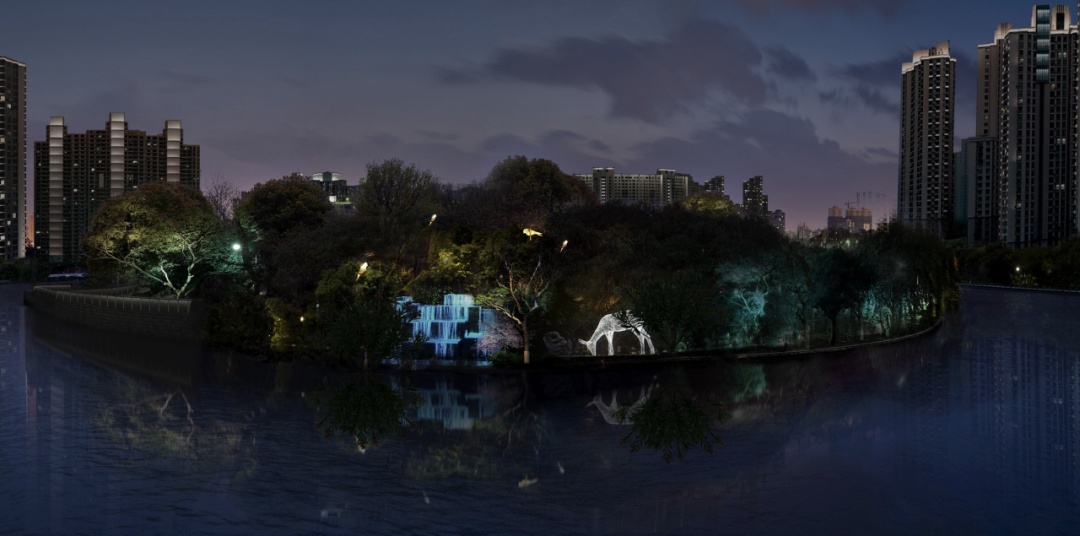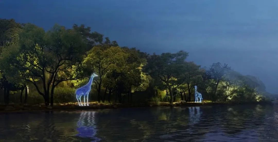 茂密的滨河树木增加绿化照明层次,树林中点缀小动物造型的灯光小品,增设灯光装置,当游船经过时,呈现山涧溪流、林中秘境的生态场景,给人以不期而遇的小惊喜。