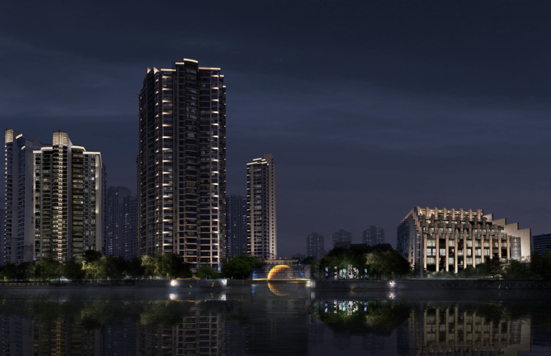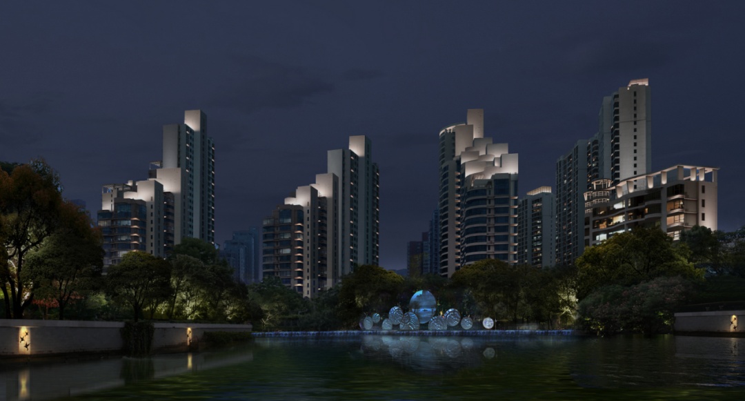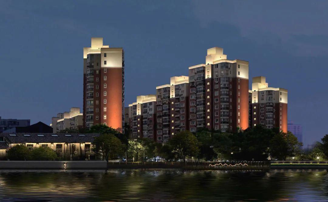 重点对沿线的大上海城市花园、绿洲城市花园、苏堤春晓、泰欣嘉园、新湖明珠城一/二/三期、东沙小区、普雄馨苑、华府樟园、风华水岸等住宅建筑的顶部进行照明,适当点缀立面,采用暖白的灯光营造温馨宜居的舒适氛围。