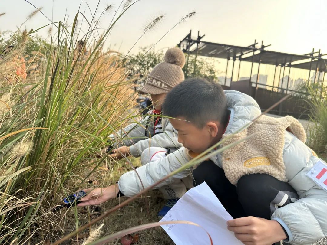 四季有景的百草园、自然野趣的雨水花园、梦幻绝美的绿之丘……孩子们探寻滨江生态,借助“形色”“花伴侣”等植物识别软件认识植物的种类、寻觅一片美丽的落叶制作成树叶标本、用画笔描绘观察到的植物或生态美景,并且在老师的带领下开展雨水花园活动,探究雨水到底怎么润花园。