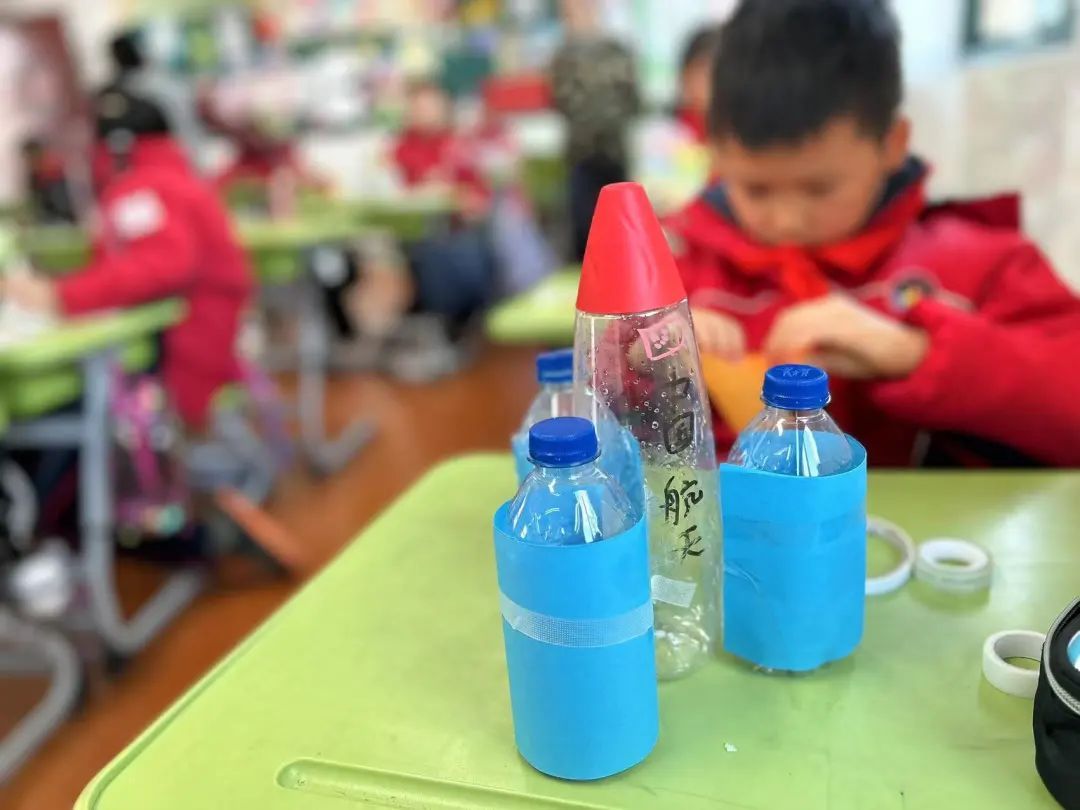 四年级学生丁妤宁向记者展示了自己的作品:“这个瓶盖就像火箭头,我用纸画了一个五星红旗画在上面,然后再把快递的纸板剪下来之后涂上颜色拼接成火箭的‘翅膀’”。