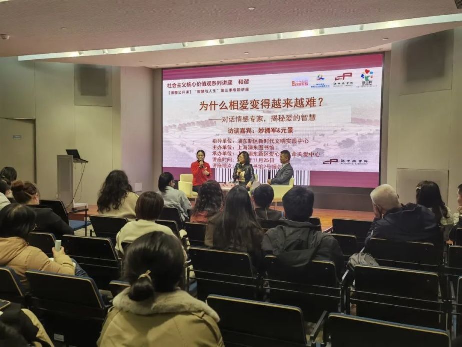 以人为本的图书馆,秉承“阅读+”的理念,不仅能让读者徜徉知识海洋,也能让更多人获取生活智慧。作为浦东图书馆政府开放日系列活动之一,近日,《人生必修课:爱的智慧》作者元景,与她的丈夫妙拥军这对“夫妻档”,在浦图带来了一场“智慧与人生”系列讲座,面向市民分享两性关系中的“爱的智慧”。