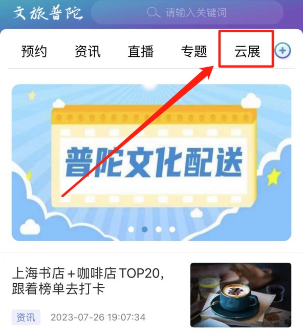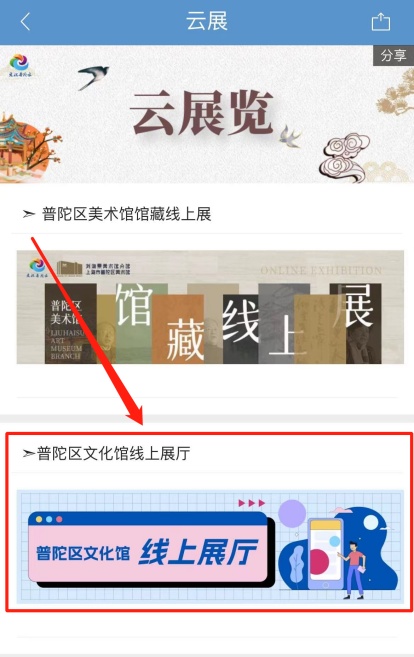 打开【文化普陀云】App,从首页点击【云展】板块,选择【普陀区文化馆线上展厅】进入。