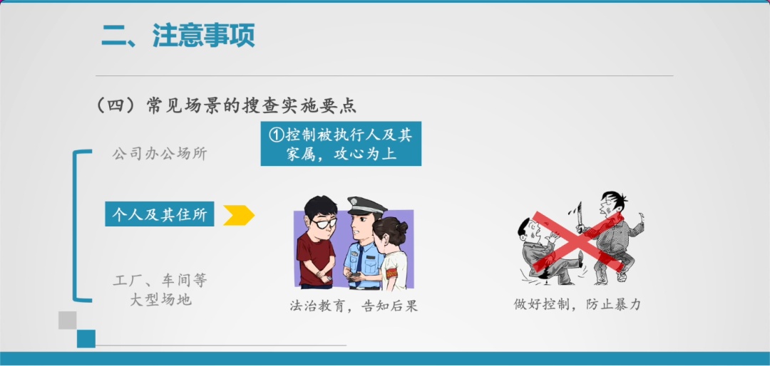 第一,要注意控制被执行人及其家属,攻心为上。宣读搜查令之前,要对被执行人及其家属进行法治教育,要详细告知拒不配合的法律后果,对拒不配合的,要安排法警对人员做好控制工作,防止暴力抗法或者自伤自残的行为。