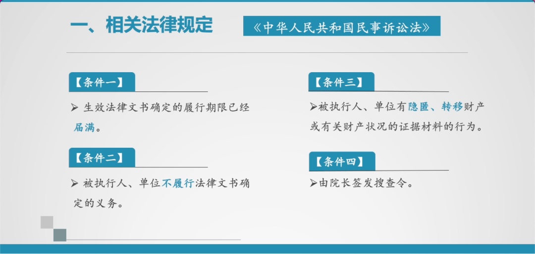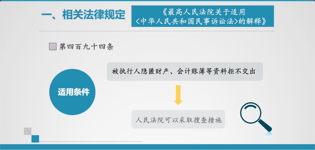 1. 《司法解释》第494条中,明确了搜查的适用条件,被执行人隐匿财产、会计账簿等资料拒不交出的,人民法院可以采取搜查措施。