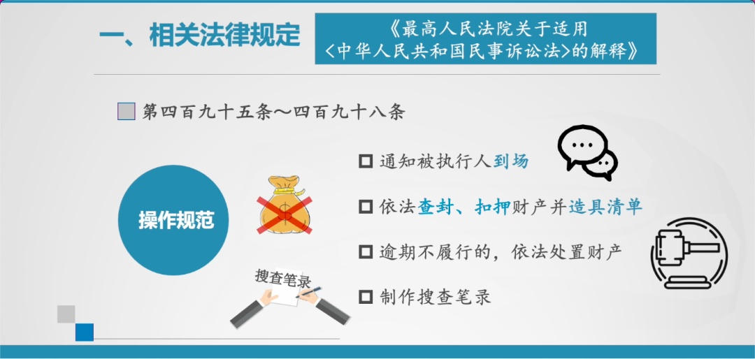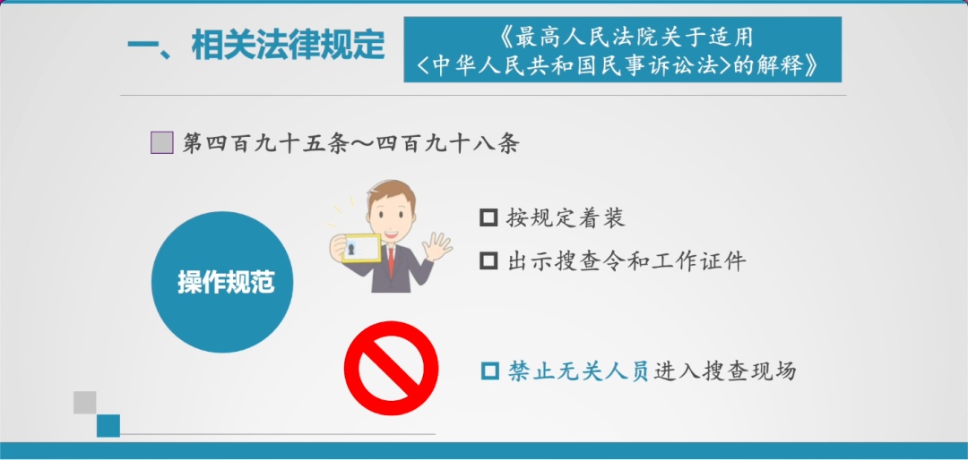 2. 《司法解释》第495条至498条,明确了搜查的操作规范,包括应当按照规定着装,并出示搜查令和工作证件,搜查时禁止无关人员进入搜查现场,应当通知被执行人到场,应当依法查封、扣押财产并造具清单,被执行人逾期不履行的,应当依法处置被查封、扣押的财产,应当制作搜查笔录等。