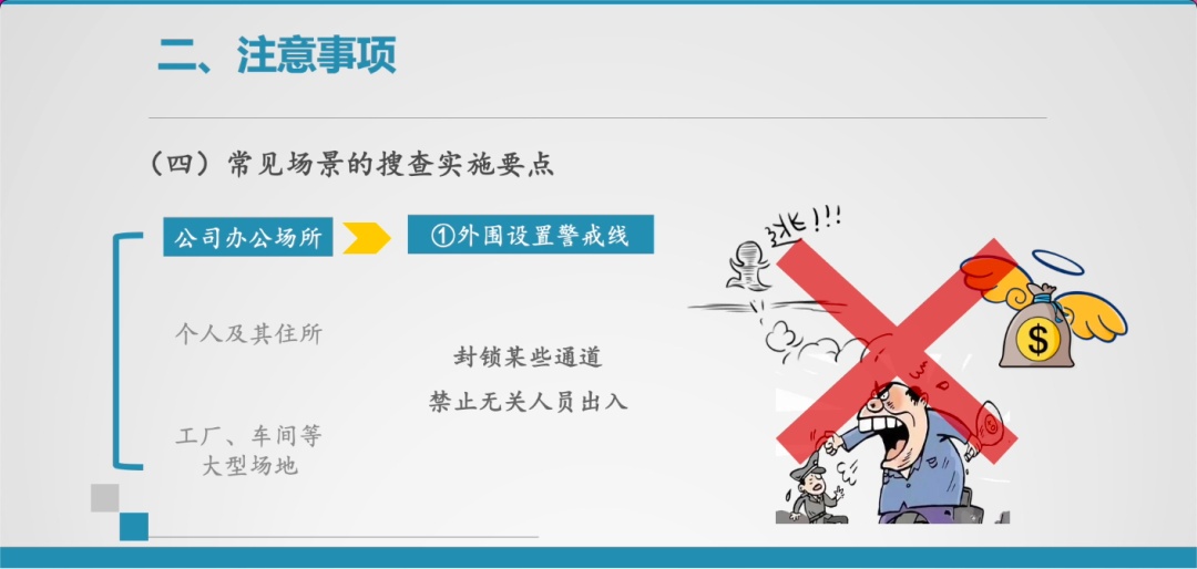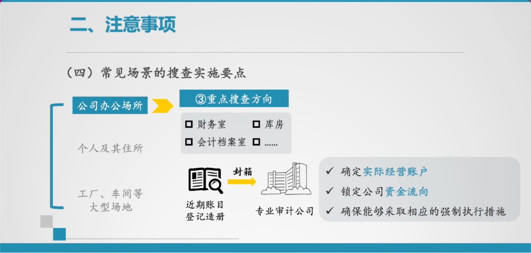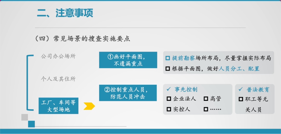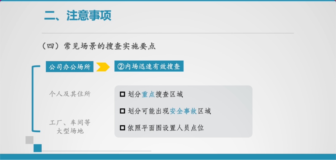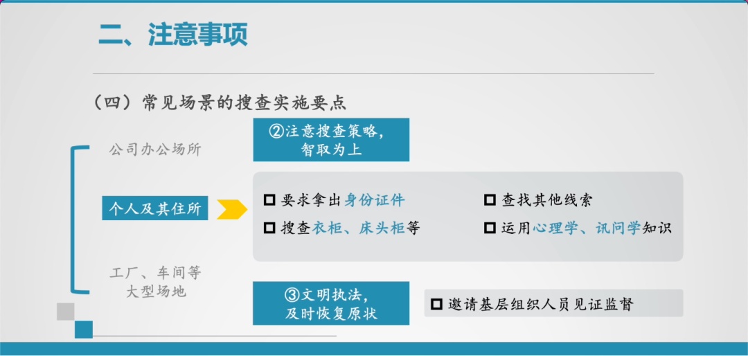 当然在不同的搜查场景下,往往有各自不同的侧重点,需要引起足够的重视。在这里我也交流一下,关于常见场景的搜查实施要点。