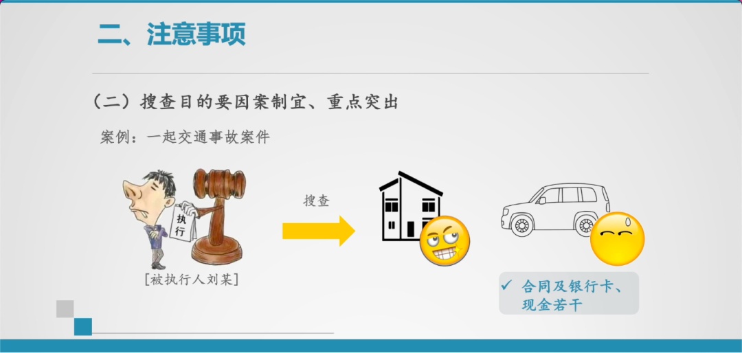 当然实践中更多的是为了直接找到被执行人隐匿的财产。那么在搜查的过程中,就应注重对一切可能隐匿有价财产的地方,进行仔细地搜查,以便及时发现财产线索。此时,善于捕捉和观察被执行人的言行举止,往往能够帮助我们找到隐匿的财物。如,我院在处理一起交通事故案件执行过程中,被执行人刘某一直规避执行拒不履行,对刘某住宅、车辆搜查时,他明显在车辆搜查时表现得更为紧张。果然在对其车内物品进行搜查时,发现被执行人与他人签订的合同,以及银行卡、现金若干,在搜查出来的财产证据面前,迫于法律的威严,刘某最终履行了义务。
