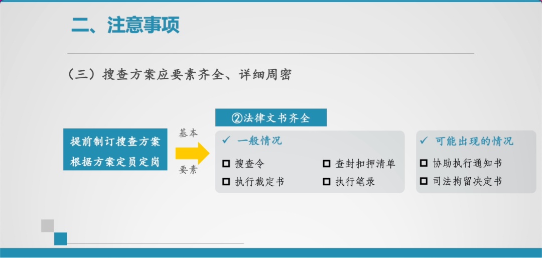 2. 法律文书齐全。搜查令、执行裁定书,查封扣押清单、执行笔录,这些是必备的,应对可能出现的不同情况,还需预备协助执行通知书、司法拘留决定书等法律文书。