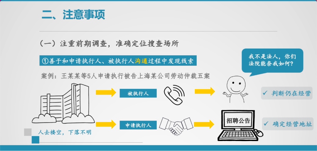 首先,要善于在申请执行人、被执行人的沟通过程中发现线索。我在执行王某某等5人申请执行被告,上海某公司劳动仲裁五案中,被执行人员经营场所已经人去楼空、下落不明。期间,我不断与被执行人实际控制人电话联系,但其态度恶劣,既不主动履行,也不愿意说出实际经营地址,甚至叫嚣道,我不是法人,你们法院能奈我如何。从通话中我判断其仍在经营,经过和申请人的共同努力,终于在网上,发现了被执行人的招聘信息,确定了新的经营地址。