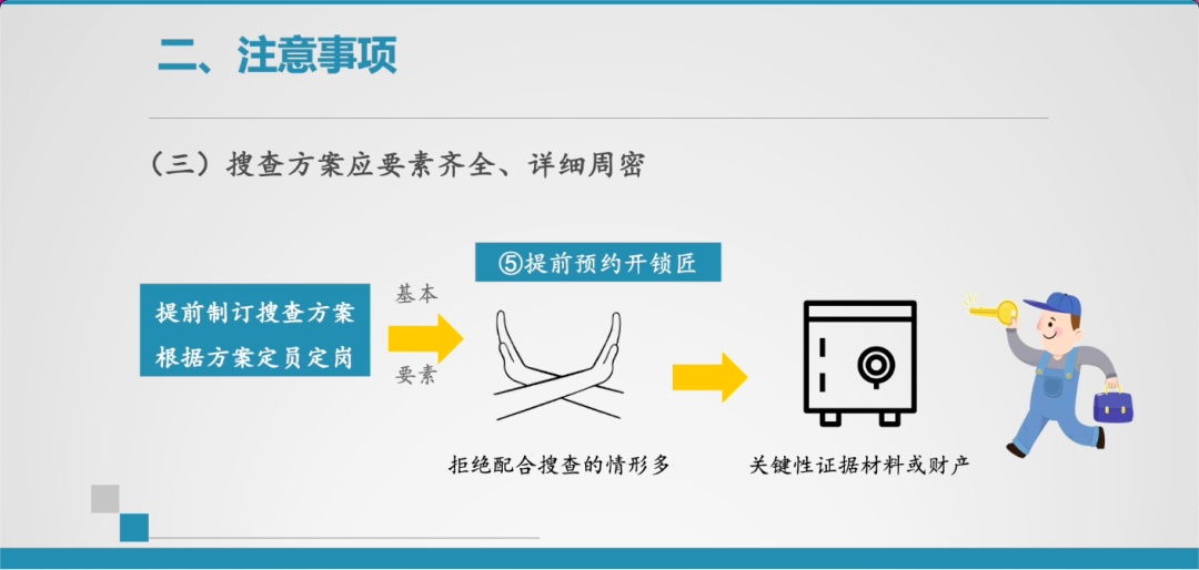 5. 提前预约开锁匠。在实践中,被执行人配合搜查的情形极少,大概率是不配合,甚至不出现在搜查现场的,而关键性的证据材料或者财产,往往会锁在相应的地方,为了防止转移财产或者证据,在责令被执行人开锁,拒不配合的情况下,可请开锁匠强制开锁。