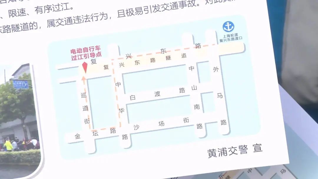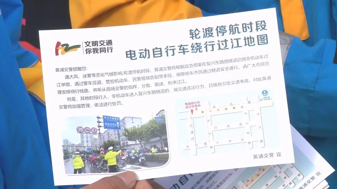 大风、迷雾等极端恶劣天气,轮渡停航,黄浦区通常会开通复兴东路过江隧道,允许电动自行车过江。这张过江地图标明了从外马路上的复兴东路轮渡口沿着复兴东路到中华路左转,到金坛路右转,到巡道街右转,最后到达复兴东路隧道口过江引导点。这条线路是交警部门经过多次现场勘测后推出的最便捷和最安全的线路。在宣传发布活动中,黄浦交警还带领快闪骑手沿着过江地图实地预演,让骑手们熟悉线路,做好应对措施。快闪骑手告诉记者,“以后遇到台风或者大雾天轮渡停航时,我们就可以按照现在的这个路线走,可以更安全、更可靠地通过复兴东路隧道过江。非常感谢交警对我们的关心”。