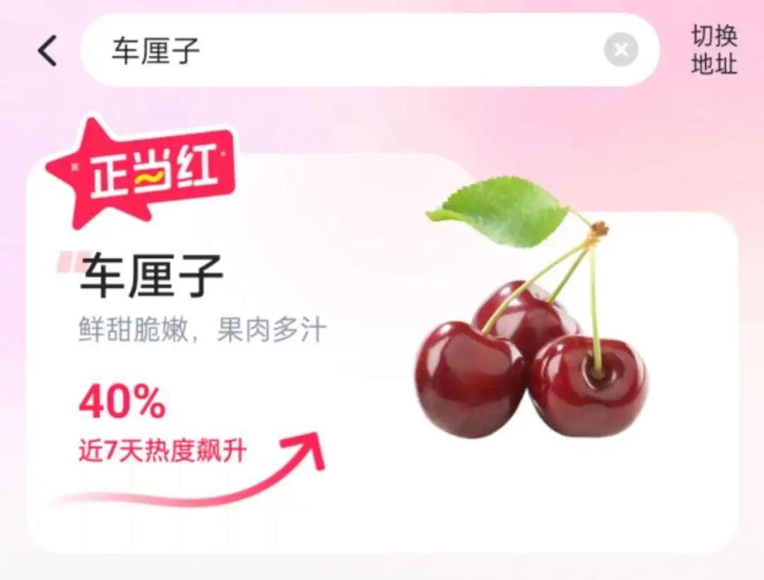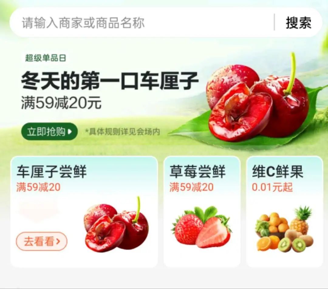在线上平台,车厘子吸引了不少没时间线下购物的年轻人。美团外卖搜索车厘子显示“近7天热度飙升”“正当红”等字样,在“水果/果切”活动页面中,“冬天的第一口车厘子,满59减20元”的推荐图片占据C位。