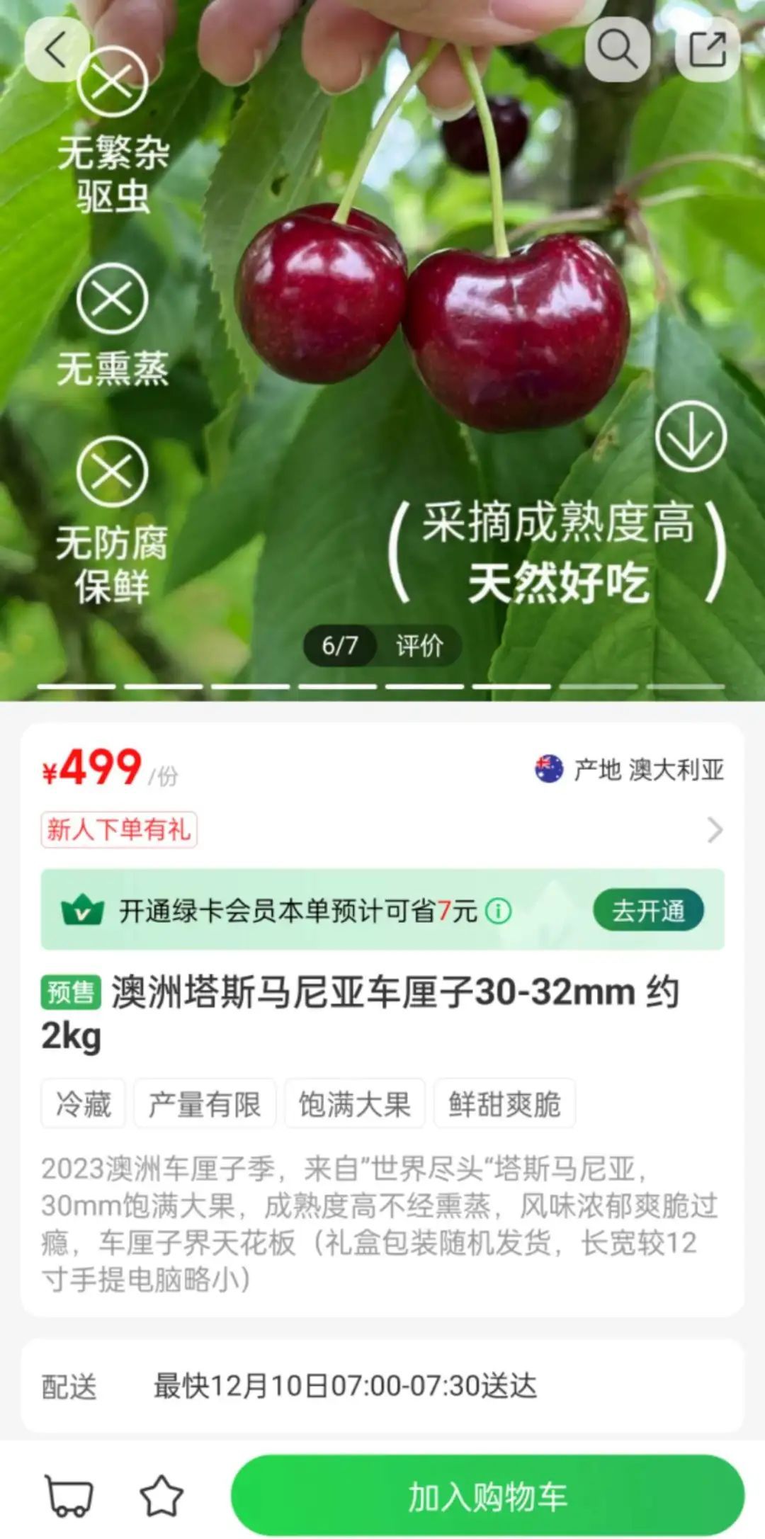 叮咚买菜上,250g的2J级智利空运车厘子卖47.9一份,2kg的30~32mm(对标智利3J)的澳洲塔斯马尼亚车厘子更是卖到499元。产地、大小、品种的不同,决定了车厘子售卖价格的下限。如澳洲塔斯马尼亚车厘子每年仅约1个月采摘期,产季短、产量少,空运直达商超,价格高也在情理之中。