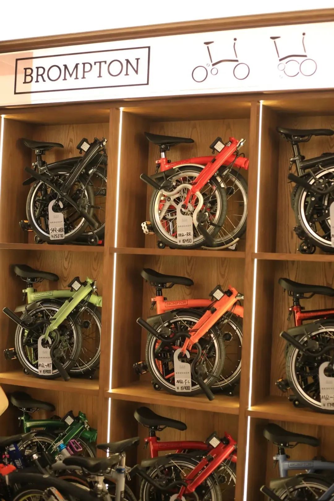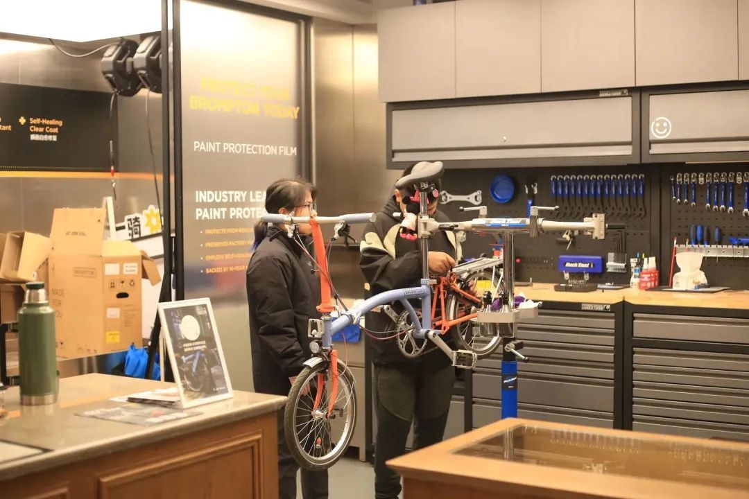 走进店铺,你会被迎面而来的复古墨绿色所包围,馥郁的木质调让整个空间弥漫着上世纪英伦的复古风情。天花板上的镜面倒映、窗台上的折叠开放,每一个细节都被精心设计,让整个店内充满了引人注目的氛围。在这里,你不仅能够找到心仪已久的“小布”,还有BROMPTON品牌的车头包系列,以及其他设计品牌的各类配件等等。只需挑选心仪的产品,剩下的改装工作就交给专业的技师吧!轻松打造出独一无二、完全符合个性的BROMPTON,让它真正成为属于你自己的特色骑行伴侣。