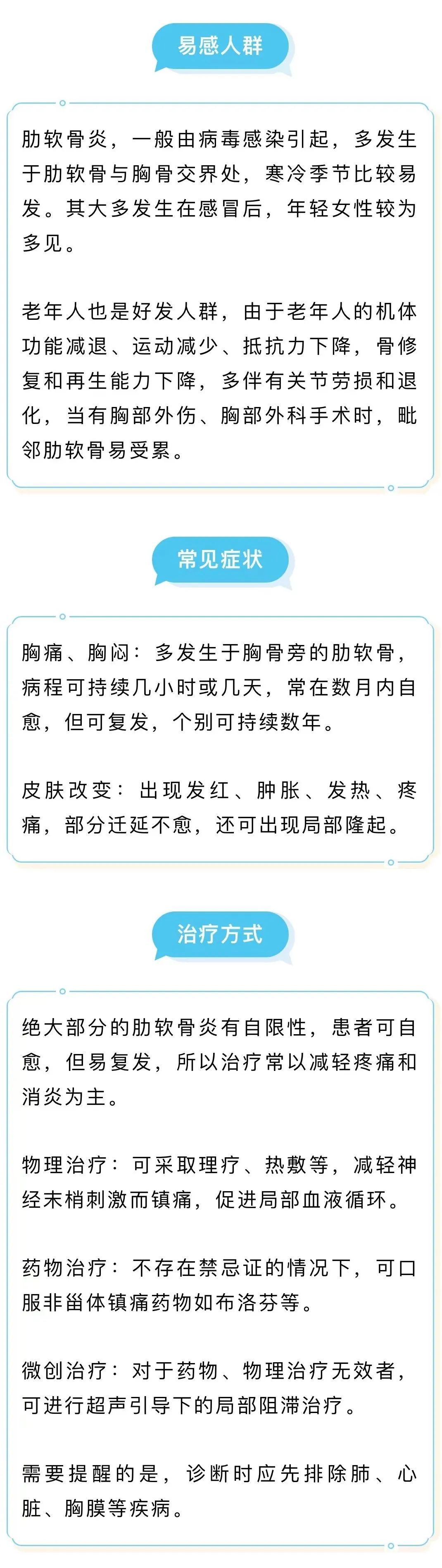 天气寒冷时,有些人会感到胸部肋骨疼痛,去医院做个检查,诊断为肋软骨炎。这是咋回事?