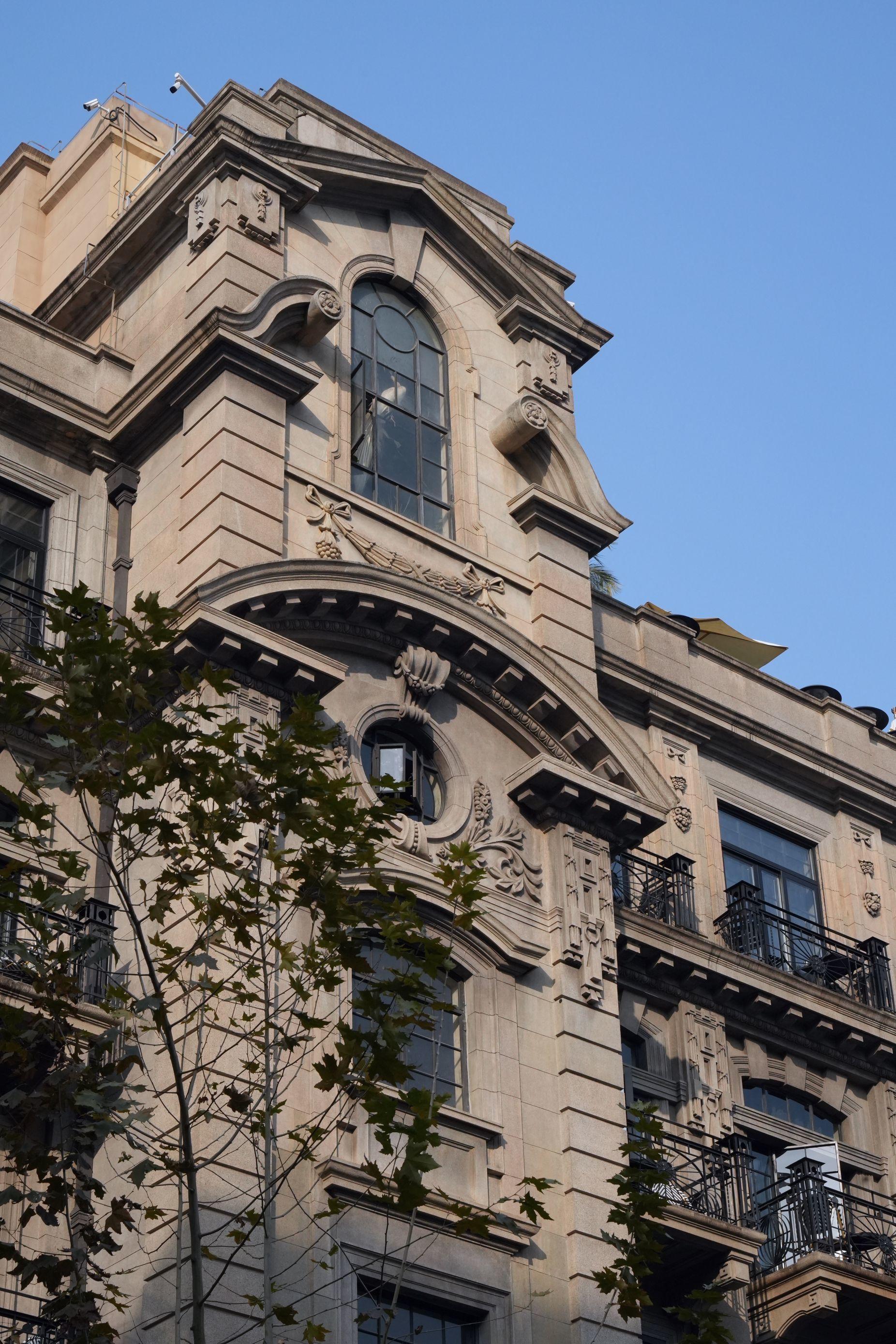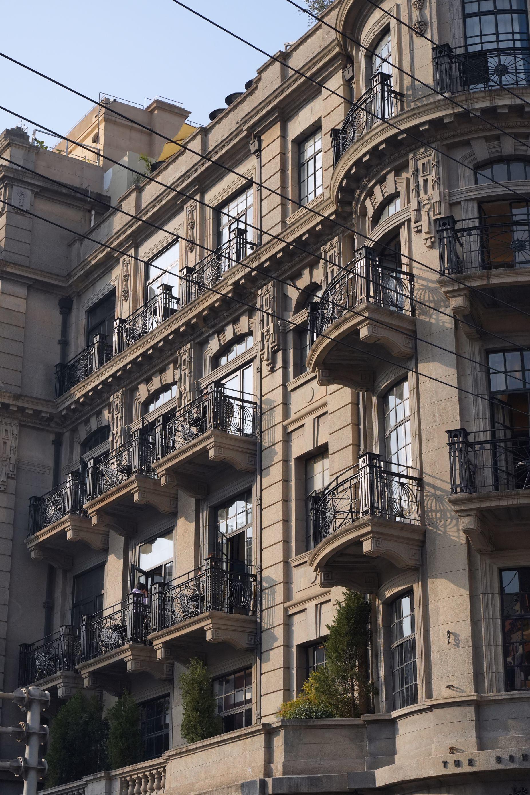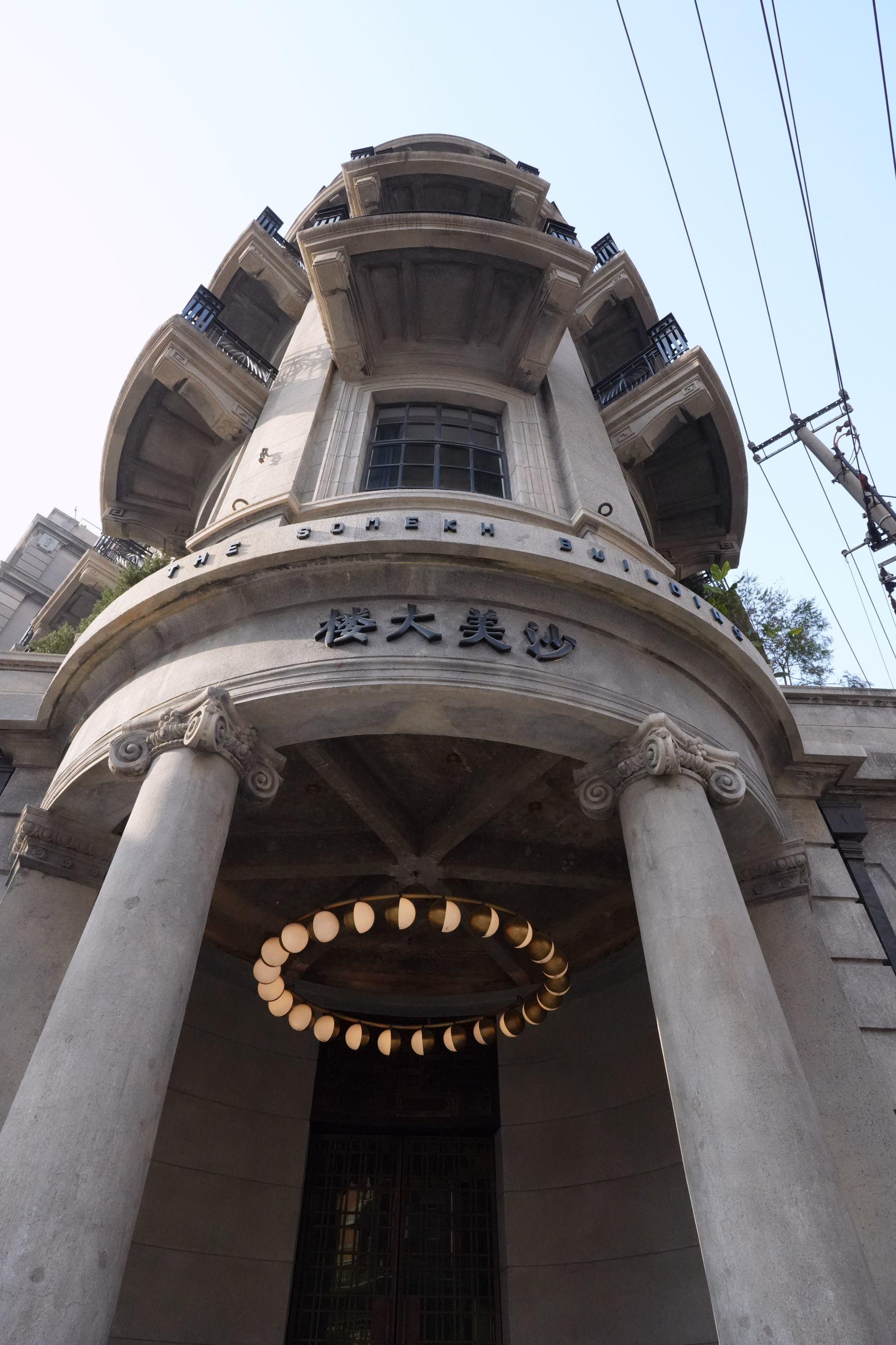 据介绍,由通和洋行设计、始建于1918年的沙美大楼,是上海最早一批钢筋混凝土结构的大楼,也是最早一批使用电梯的大楼。它的立面建筑元素丰富,厚重敦实的米色系水刷石外墙,强调曲线和浮雕,简洁精美又不失大气。入口处是半圆形的拱门洞,还设置了一个相当完整的古典柱廊,上面则是带有巴洛克风格的山花装饰。