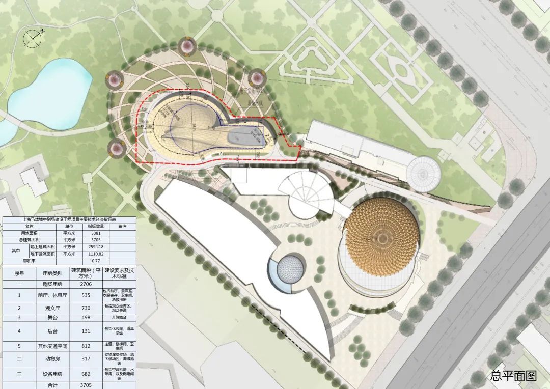 该项目位于马戏城内西南角,总建筑面积3705平方米,地上两层,地下一层,建筑高度为23.9米,其中地上总建筑面积2594.18平方米,地下总建筑面积1110.82平方米,容积率0.77。前厅535平方米,观众厅730平方米(800座含4个残障人士席位),舞台498平方米。主要功能为剧场、兽房、演员化妆室、候场区及设备用房,配备先进的舞台机械、灯光、音响、视频投影设备设施。