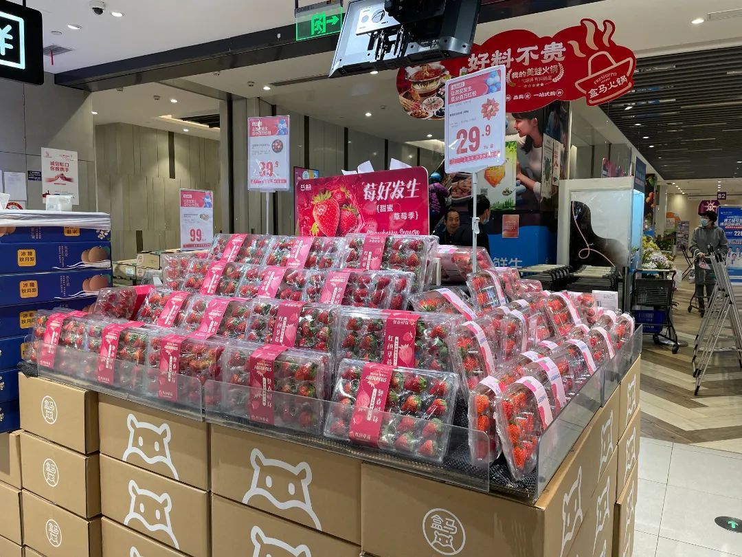 近日,记者走访位于上滨生活广场的盒马鲜生发现,除了常见的热带水果外,草莓、金桔、橙子等时令水果都被摆放在最显眼的位置,不时有市民驻足,在水果摊位前挑选一番。