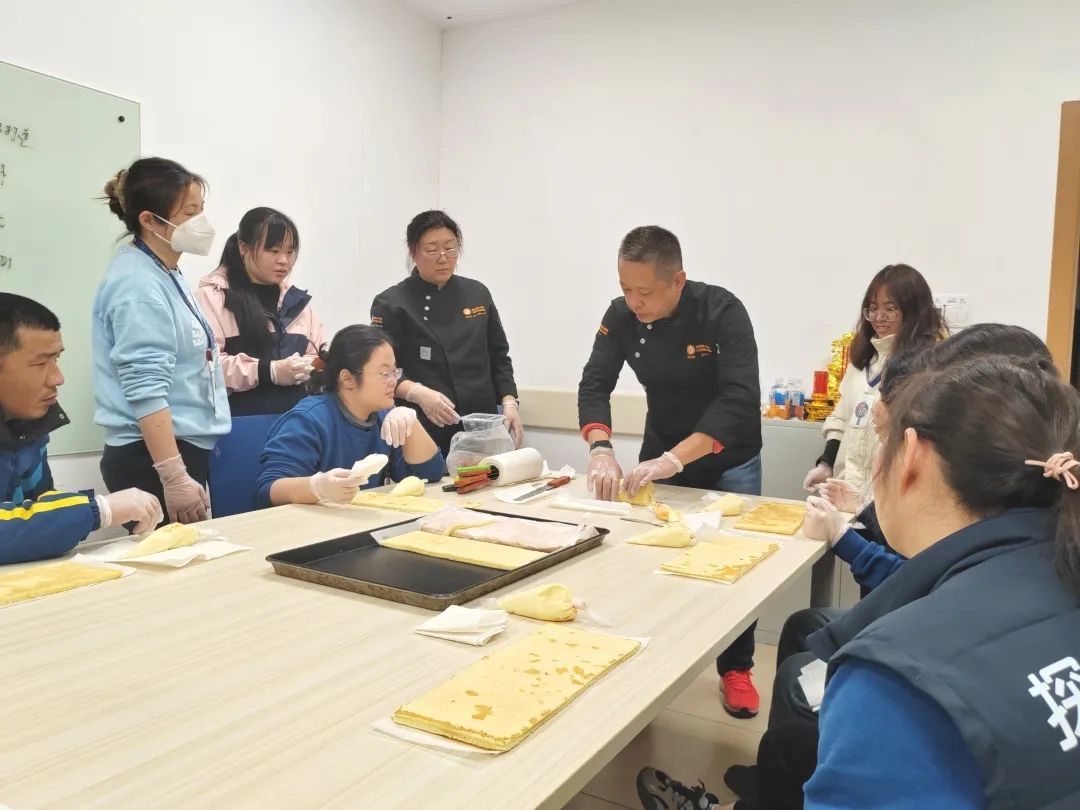 曹杨职校专业烹饪教师徐晶、顾帧霖通过理论讲解结合实操的方式,现场进行烘焙课程的教学。老师们介绍了制作蛋糕卷需用到的食材和各种工具的使用方法,并仔细讲解、演示了蛋糕卷的制作过程,包括涂抹奶油、制作“倒角”、如何卷得好看有型等。