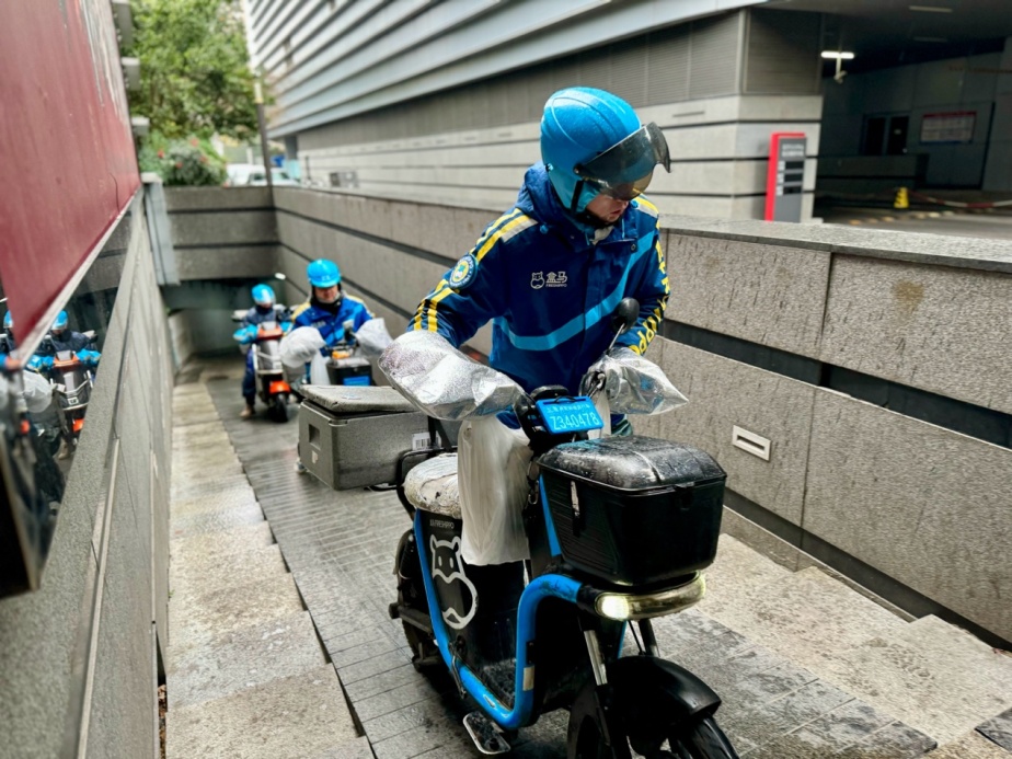 线上订单量大,除了门店拣货员忙碌不停,配送员也满载着食品在寒风中穿梭。