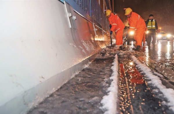 截至当天下午6点,全市城管累计出动16198人次、机械车辆1476台次,撒播融雪剂196吨,铺设草垫20783个,清除积雪较为严重的道路2392处。
