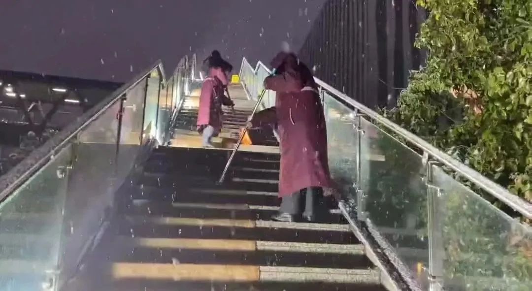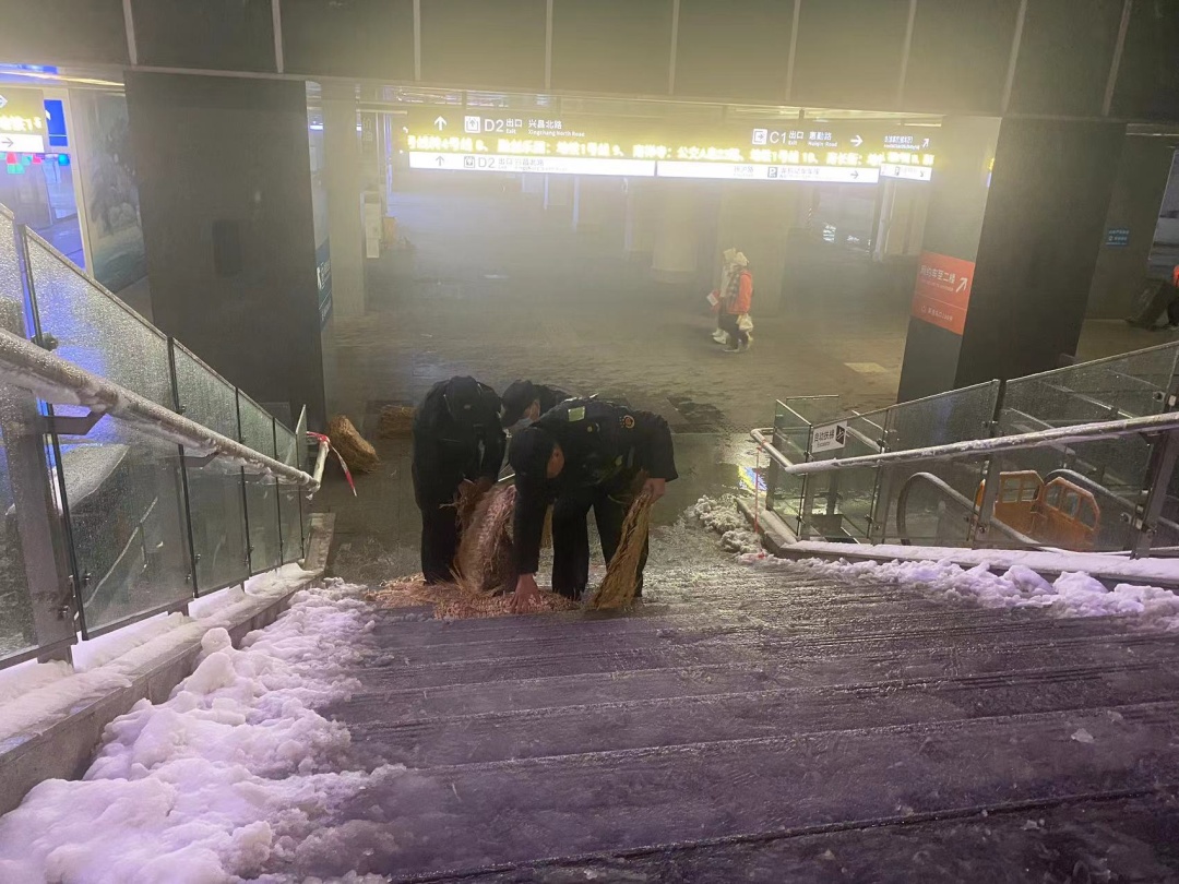 晚上8时,地铁1号线堰桥站外灯火通明,通向站厅的人行天桥上,工作人员一刻不停地在清理积雪。
