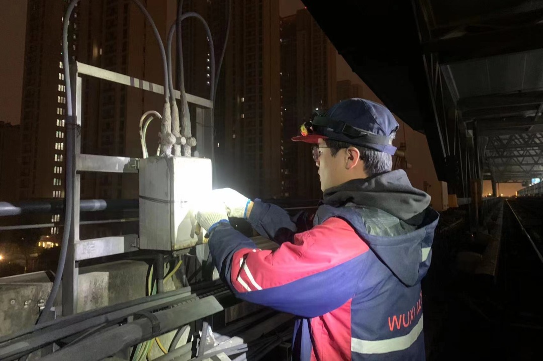 夜里10时,线网列车陆续停运,无锡地铁运营工作人员开始夜间巡检,“清除高架段残留积雪,确保轨行区安全,这项工作只能夜里进行。”无锡地铁工作人员冒雪在高架段展开安全检查,对每个可能在雨雪天产生隐患的部位进行排查。