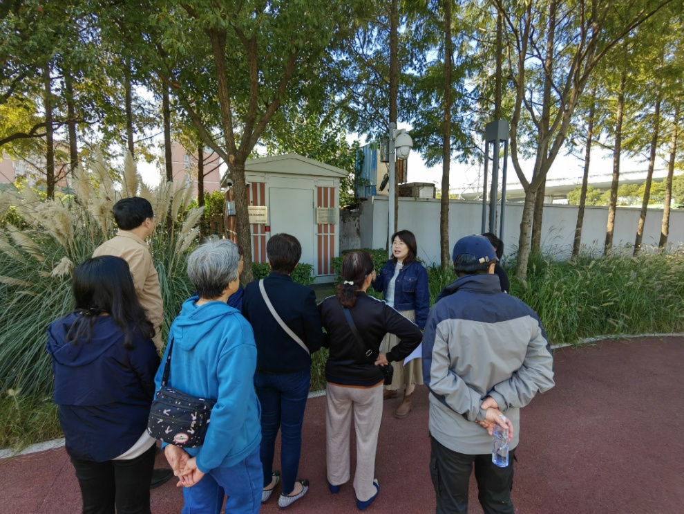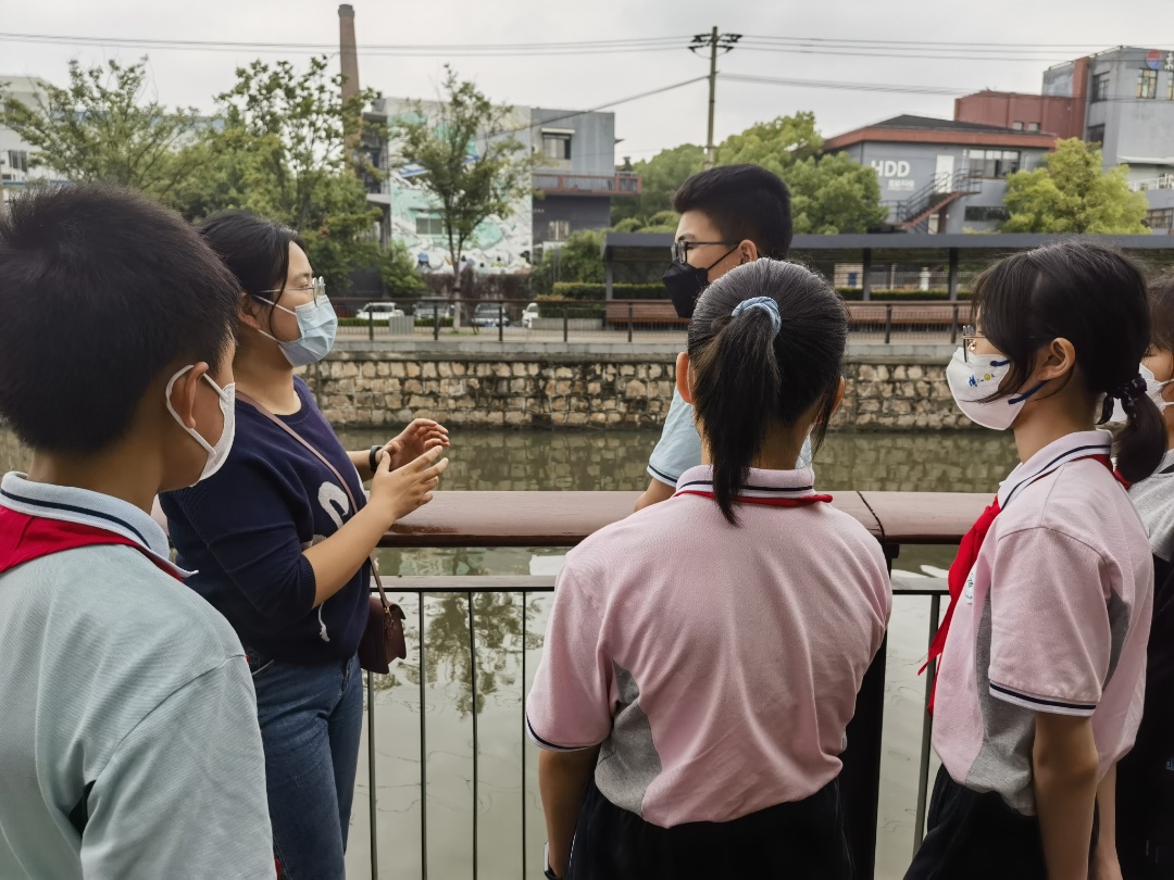 走在彭越浦—汶水路段的河道旁边,工作人员一边为同学们介绍水站周边的河道环境,一边介绍区环境监测站的基本情况,让大家了解关于环境监测相关基本概念,了解什么是环境监测、河道水质监测的意义,以及生态环境保护工作者为改善生态环境质量所付出的努力。