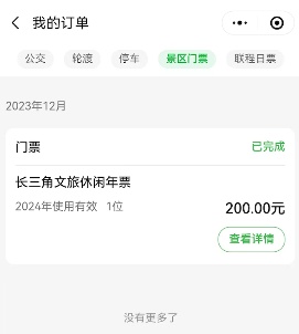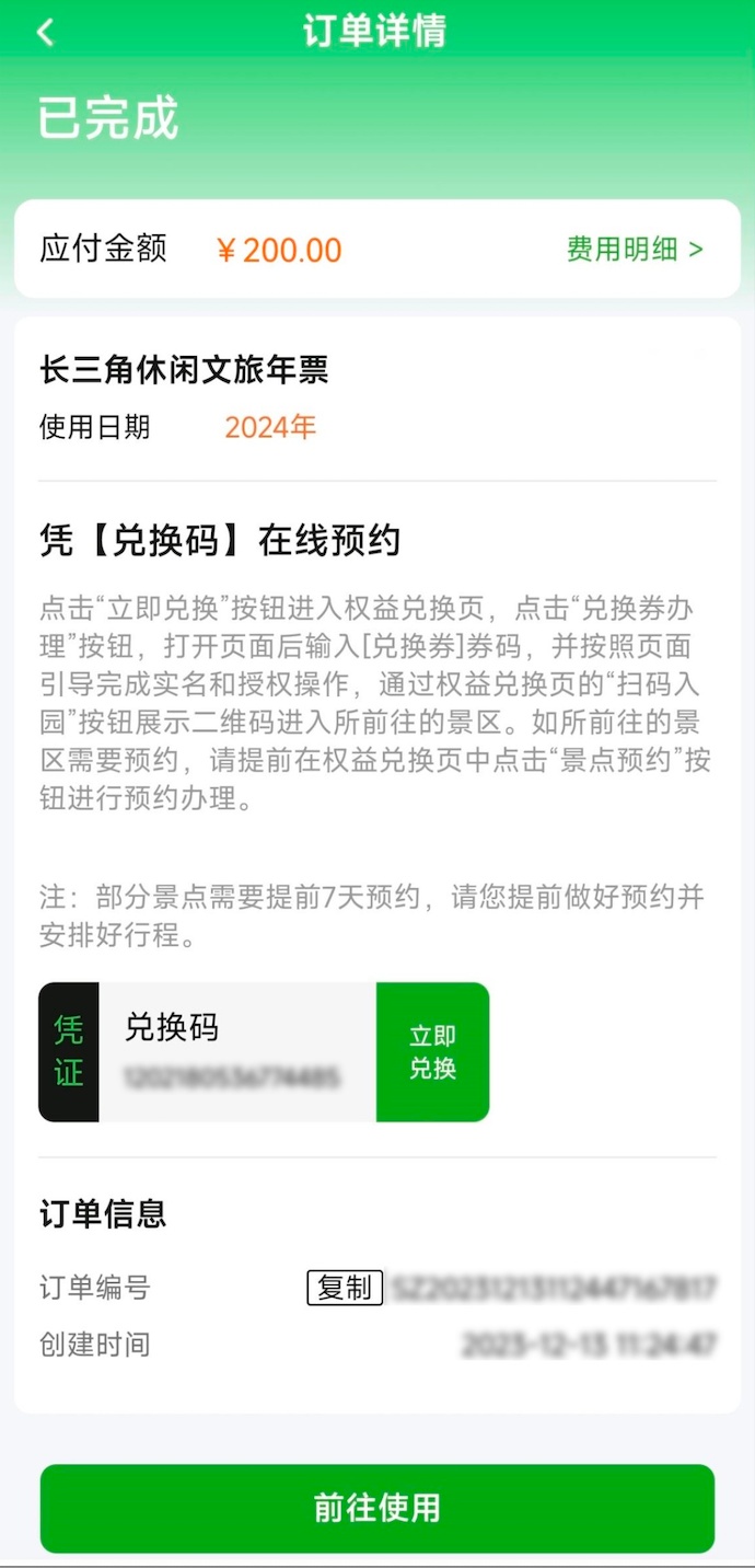 2.【景区门票】列表,选择已完成的【长三角文旅休闲年票】查看详情,进入订单详情页,点击【前往使用】。