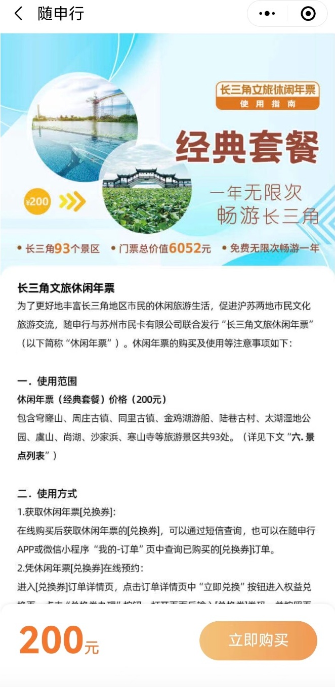 休闲年票精选了长三角93个景区,周庄古镇、千灯古镇、寒山寺、沙家浜、金凤凰温泉……原门票总价值6052元,现只需200元,一票纵享,无限次畅玩一整年!