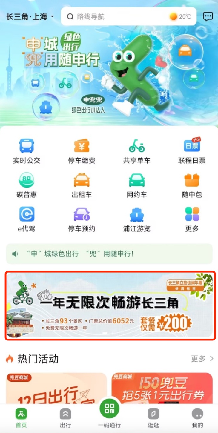 1.打开“随申行”APP或微信小程序,点击首页“长三角休闲文旅年票”活动页面。