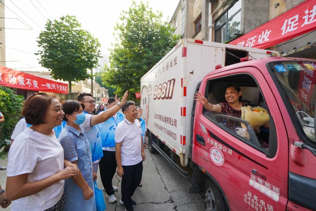 8月18日,曾居住在长桥街道长桥新村的居民戴静文,坐在搬场车上接受了居委赠别的鲜花,她的脸庞流露出依依不舍之情,那是对60年来承载了三代人记忆的旧居的不舍,也是对即将搬进宽敞新家的期待。
