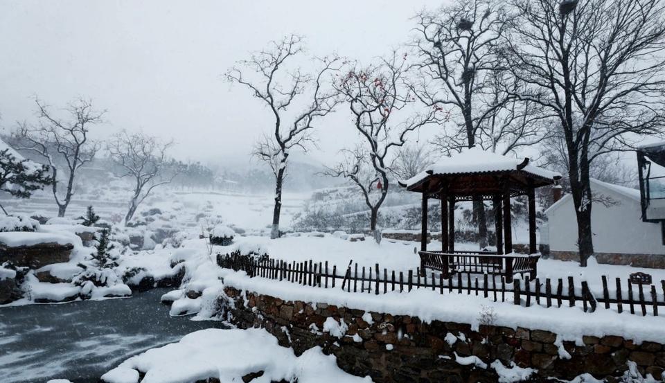 踩着酥酥软软的雪,沿着山路前行,只见枝头红柿点缀,白雪盖头,娇羞美艳。树下流水潺潺,清澈的溪水穿过白雪覆盖的层层石阶缓缓流淌,远道而来的游客可以近距离感受这份大自然赐予的舒适和惬意。