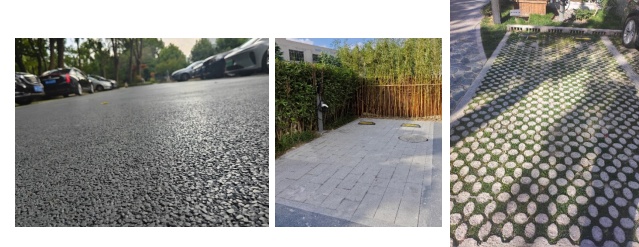 本项目结合区域的使用功能,设置了多种透水铺装,包括停车场区域的透水砖、生态植草砖和行车道上的透水混凝土等,占总铺装面积的70%,可有效降低径流系数,控制径流污染。