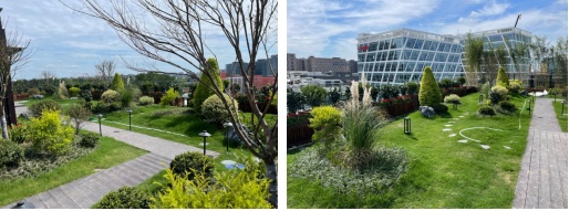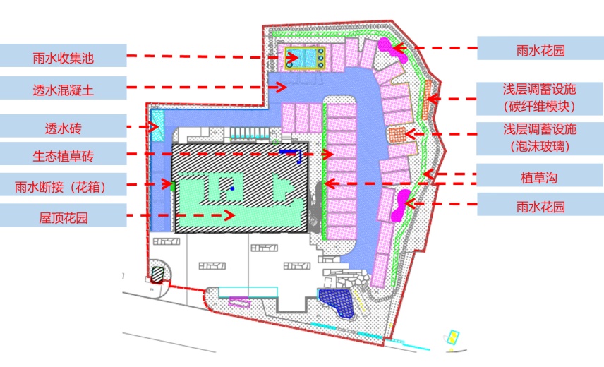 本项目设置了屋顶绿化,排水层上方设置10cm厚玻璃轻石/泡沫玻璃板,以提高屋顶绿化对雨水的储存和净化能力。同时,储存雨水可通过植物根系的毛细作用回补植物用水,减少绿植浇灌用水量。