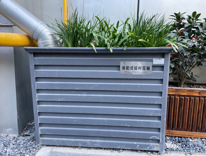 位于办公楼西侧设置了装配式花箱,屋面雨水经断接进入装配式花箱调蓄、净化,超标雨水溢流排放,雨停后储存雨水缓慢排放,错峰排放,减少雨水管网排水压力。