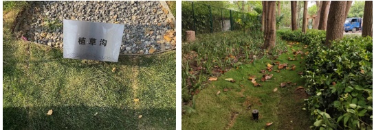 园区停车场东西两侧均设有植草沟,周边雨水通过径流或开口路缘石进入植草沟,雨水转输过程中,在植被的作用下,削减径流污染,最终转输进入雨水管渠。
