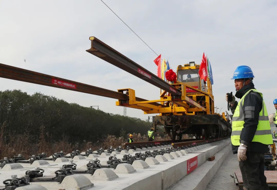 12月26日,上海市域铁路机场联络线轨道铺设项目迎来了新进展。随着铺轨牵引车引导的2根500米长钢轨缓缓落入扣件承轨台,标志着轨道工程进入了长钢轨铺设阶段。