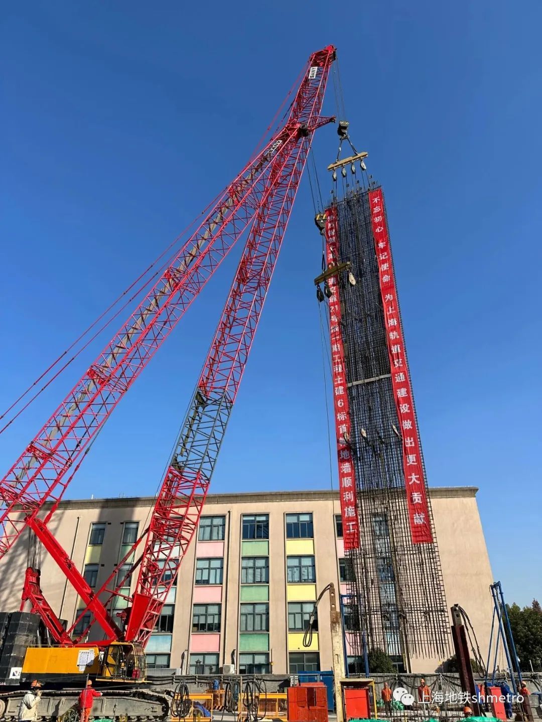 本次施工的首幅地墙E34宽6米,深47米。12月20日,经建设集团第四分公司、总体院、工点院、监理及施工各方验收首幅钢筋笼合格后,采用250吨和150吨履带吊双机抬吊完成钢筋笼起吊、拼装、入槽。