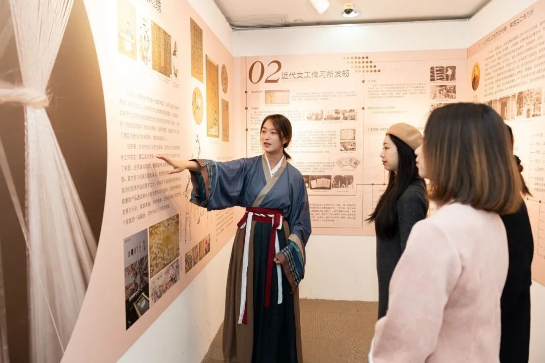 展区二梳理了从1898年至1937年设有绣工科、刺绣课的女校或专门的女工传习所、蚕业学校的开设情况,并统计了1901-1937年江苏省设有刺绣课的传习所以及如沈寿、丁渭琦、杨守玉等近代女工刺绣专家,勾画出近代女子女红职业教育的概貌。