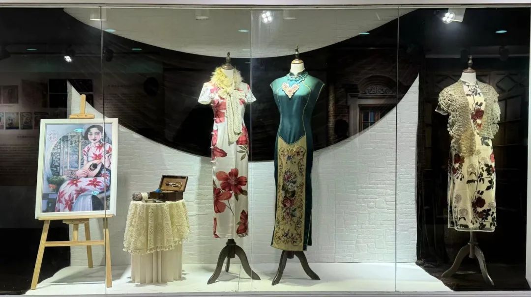 “冯秋萍们的编织世界”是此展览中的一大亮点。冯秋萍、黄培英是绒线编织的代表人物,她们不仅积极开办编织学校,亦编写多种绒线编织教材,构筑起多彩的“编织世界”。展览打造了类似近代上海石库房的场景,陈列旗袍、套装、学生装等各类近代时装,引导观者体味上世纪二三十年代上海毛纺织业之繁荣。