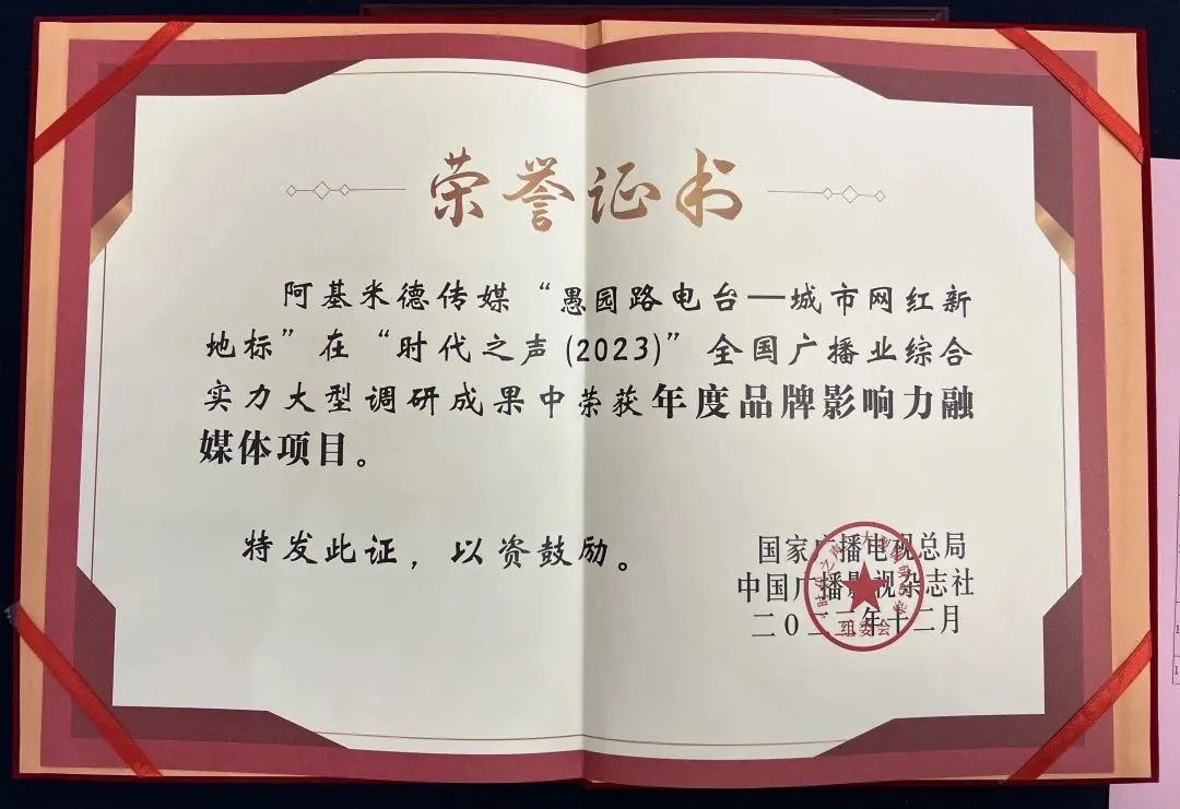 近日,阿基米德传媒旗下“愚园路电台——城市网红新地标”在“时代之声(2023)”全国广播业综合实力大型调研成果中荣获年度品牌影响力融媒体项目。