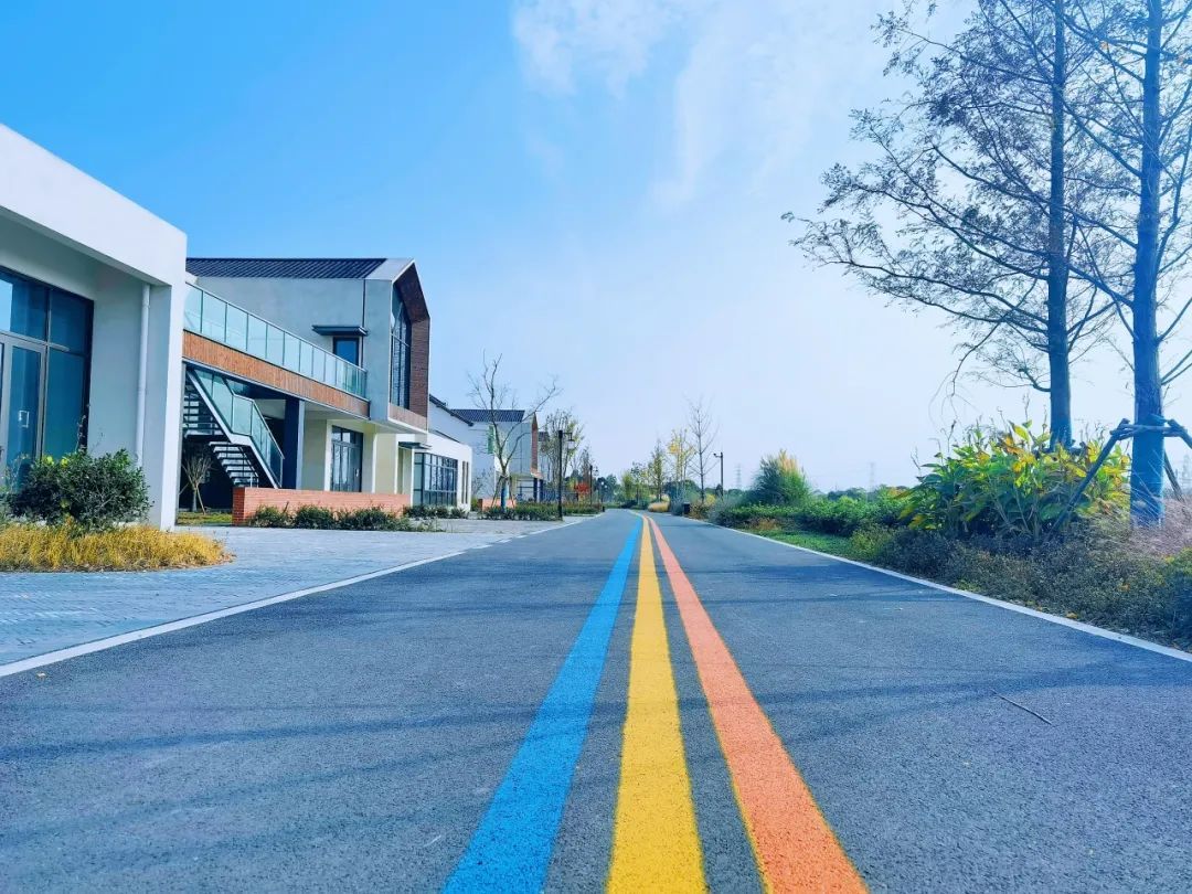 近期在同盛路上也出现了一条“彩虹道”,西起友谊路与同盛路交叉口,一路向东途经渔沥林盘、英科中心、涵养林、村宅和农田,终点位于渔汇路与同盛路交叉路口。“彩虹道”友谊路起点处,大地艺术景观呈现秋收时金灿灿的稻田和初春时绚丽的花海。同盛路两侧的渔沥林盘更是明星点位,此处景色宜人,英科中心坐落其中,是渔沥村试点探索宅基地改革和总部经济的标志性项目。