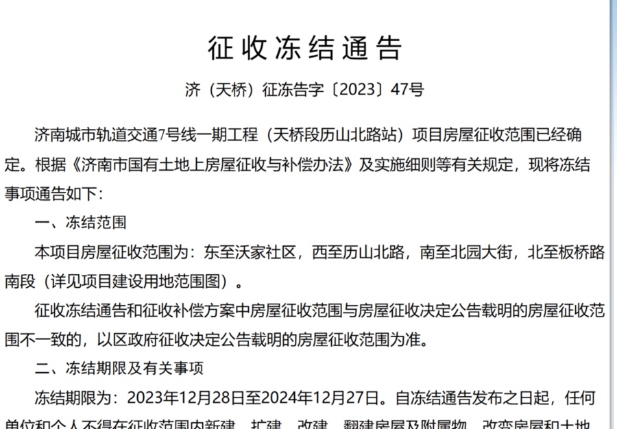 近日,济南市住房和城乡建设局发布征收冻结通告,济南城市轨道交通7号线一期工程(天桥段历山北路站)项目房屋征收范围已经确定。冻结期限为2023年12月28日至2024年12月27日。
