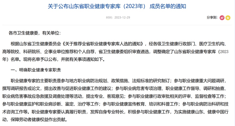 关于公布山东省职业健康专家库(2023年) 成员名单的通知