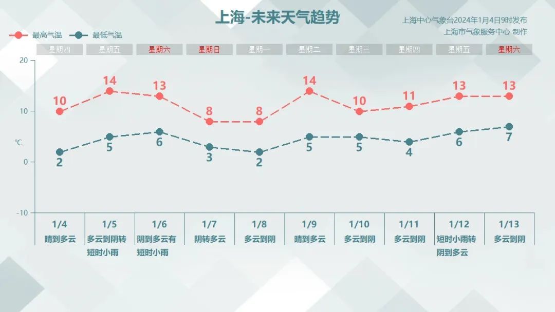 明日天气:明天上海天空云系增多,夜间有短时小雨出现。全天气温在5~14℃之间,白天体感会温暖不少。但由于天气总体静稳,大气扩散条件不好,明天空气中颗粒物浓度仍较高。