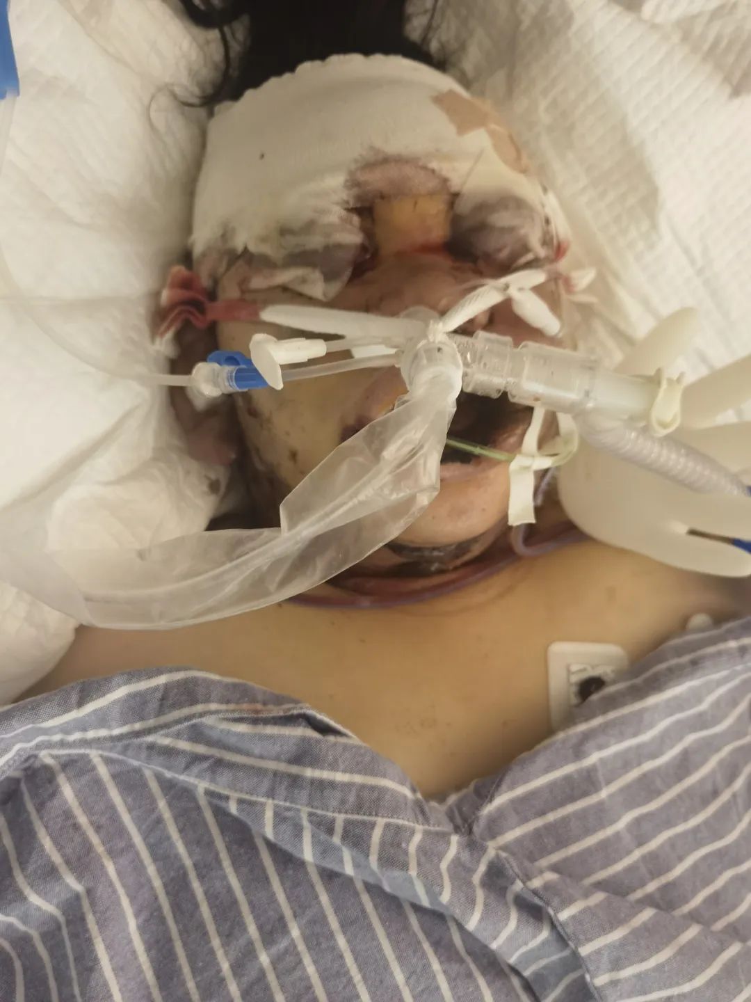 面对“七窍流血”的王女士,护理工作更是需要绝对的细心。“我们很难看到她的眼球位置,再加上她口腔内持续渗血,鼻腔内鼻插管的固定相对困难,需密切观察鼻插管,以防滑脱;同时颈部皮肤不断有血水渗出,需时时擦拭,以减少感染风险。”重症医学科王枫护士长说。