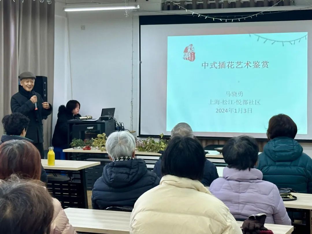 同时,悦都居民区围绕悦心园艺角,组织开展文化活动和园艺体验项目。活动当天,恰好迎来了新年第一节园艺教学活动,在辰山植物园的支持下,邀请到岭南插花花艺大师马骁勇为居民们讲授《中式插花艺术鉴赏》,并且带来了不少花材现场演示。